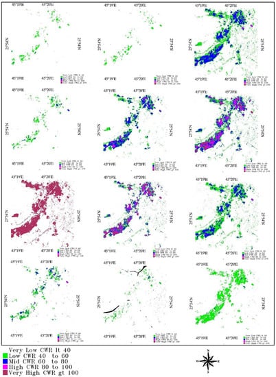 Monthly CWR maps for Al Majmaah were created using the monthly Kc estimated in the earlier section and ETo calculated using the environmental dataset (Figure 11). CWR maps were categorized into five categories: ≤40, 40–60, 60–80, 80–100, and ≥100. According to the CWR maps, the summer months of June, July, and August require the most water for crops, while the winter months require the least. It was clear that the higher temperature and lack of rainfall in summer months necessitated more water for crops, whereas winters get rainfall and the relatively lower temperatures mean that less water is required for crops.