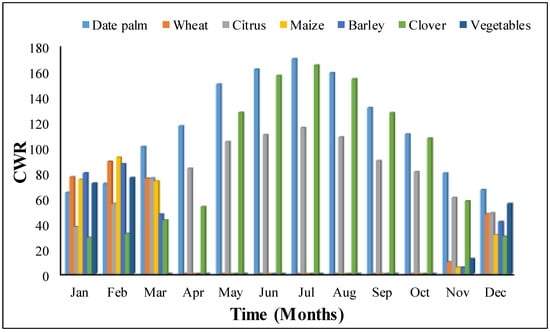 The annual CWR (in mm) for the seven crops evaluated in this study were 1377, 296, 964, 275, 259, 1077, and 214 for date palm, wheat, citrus, maize, barley, clover, and vegetables, respectively. Due to their perennial nature, date palm, citrus, and clover can be found throughout the year (Figure 12). CWR requirements were found in wheat, maize, barley, and vegetables between November and March. CROPWAT model-based CWR confirms the PS-based dataset showing the highest CWR requirements for July. In July, the date, clover, and citrus plants required 170 mm, 164 mm, and 115 mm of CWR, respectively. Figure 13 depicts a separate CWR for all seven crops.