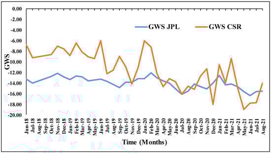 An attempt has been made to examine GWS change using the GRACE and GRACE-FO datasets for Al-Majmaah (Table 3). The CSR-based GWS trend revealed a rapid rate of water depletion. GWS based on JPL, on the other hand, showed far less depletion (Figure 15). Similar observations were made by others [15,22]. The important aspect to note is that GRACE’s spatial resolution is relatively coarse (~400 km) and has a combined multitude of parameters. Thus, it may be overestimating the values for a region such Al-Majmaah.