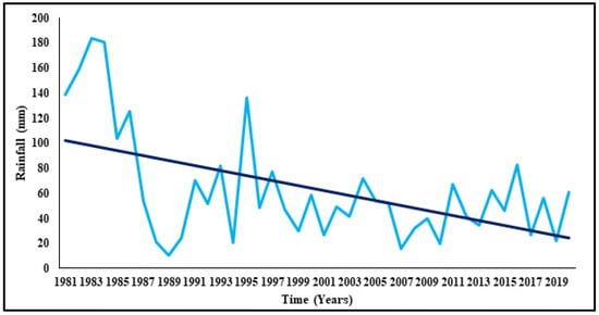 Long-term trend of rainfall for Al Majmaah from January 1981–December 2020 based on CRUTS version 4.0.5 data. The x-axis represents years, and the y-axis represents annual rainfall in mm.