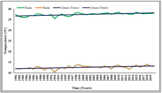 Long-term trend of temperature for Al Majmaah from January 1981–December 2020 based on CRUTS version 4.0.5. The x-axis represents years, and the y-axis represents the Tmin and Tmax in °C.