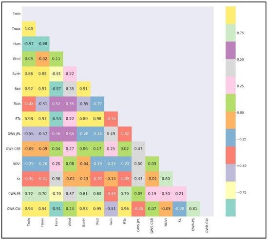 The monthly averaged CWR calculated using PS and the CROPWAT model had a greater correlation (r = 0.83) in the current study. The efficiency of high-resolution PS data to get the finer vegetation details may be the fundamental explanation for this good correlation. We utilized the most recent identical climatic data to estimate ETo and the efficiency of high-resolution PS data to get the finer details of vegetation. CWR was generated using four years of high-resolution data in this study. Furthermore, the availability of daily PS satellite data with a very high temporal resolution can provide CWR at a daily resolution, which is particularly useful for near real-time water management decision-making in sustainable agriculture. The future scope of the present investigation is to use advanced deep learning models [36,37] to predict the CWR based on high-resolution satellite data and climate data.
