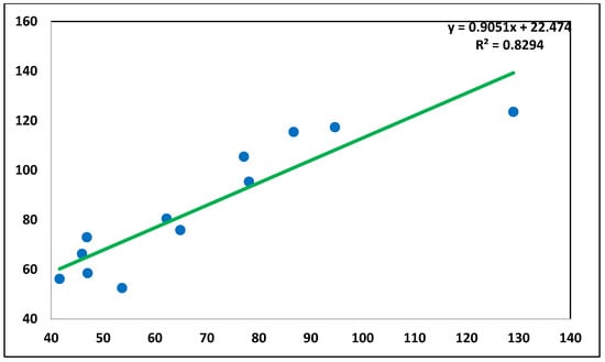 A well-known study [20] found that combining MODIS NDVI and Kc yielded a combined regression model with an R2 value of 0.82. The combined model has a similar R2 value in the current investigation. Equations (16) and (17) show the integrated model of Kamble et al. [20] with the current investigation.
