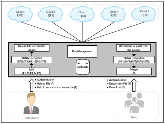 • Decryption: After downloading all the file parts associated with the requested file, each part is decrypted separately using the corresponding secret key used for encrypting that part. The proposed system model uses BDNA decryption algorithm for the decryption process;