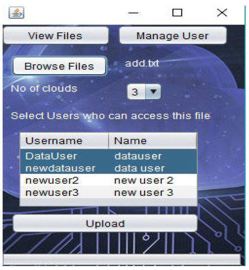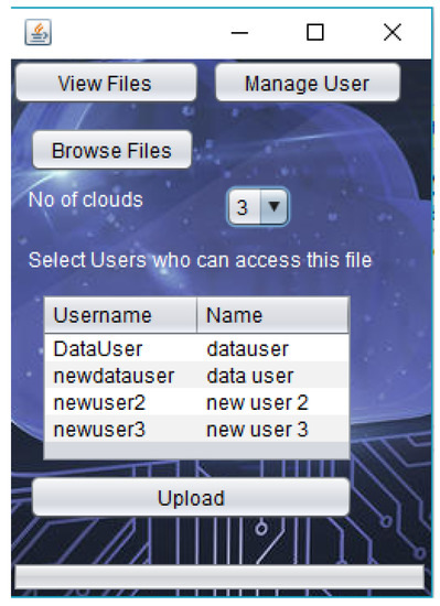 • Upload file parts to the clouds: After the successful encryption of the different file parts, each file part is separately uploaded to a different cloud. The parts are distributed randomly, and it is possible that one or more clouds may not receive any part of a given file. Different users can have a file with a same name, so while uploading the files with same names, it may be possible that a file with the same name may already be present on the cloud. This could lead to files being overwritten. So, in order to overcome this issue, we used a file naming scheme, where the filename is appended with the unique timestamp values, so that no two files can have the same name. This file naming process is transparent to the end users. The users only use the original filenames which they have provided at the time of uploading the file to the security framework. Besides these unique file names, a proper indexing of the file parts was completed, so that at times when the original file needs to be reconstructed, it is easier to identify all the file parts;