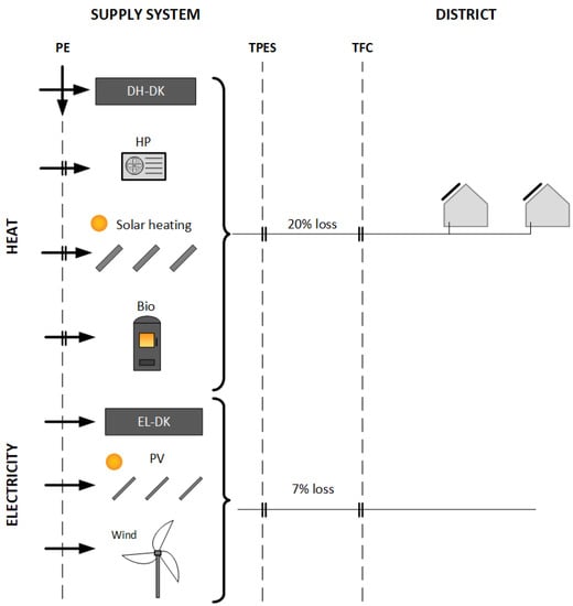 Total final consumption (TFC) is the energy needs in the district calculated with the energy calculation tool and includes space heating, domestic hot water, electricity for operation and household, and losses from the internal district heating network. A system heat loss of 20% of district heating production and 7% of electricity production (TPES) is included in the calculations, corresponding to typical Danish values. These values were developed by the Danish Energy Agency [22]. The analysis includes heat production from district heating with average data for district heating in Denmark (DH-DK) and from renewable energy, such as solar heating, biofuel (Bio), and heat pump (HP). Electricity consumption is covered by the general grid with average data of electricity in Denmark (EL-DK) and from local renewable energy, such as photovoltaic panels (PV) and wind turbines (wind).