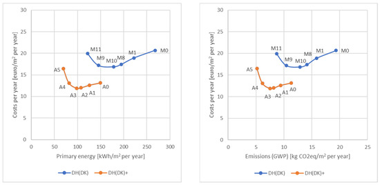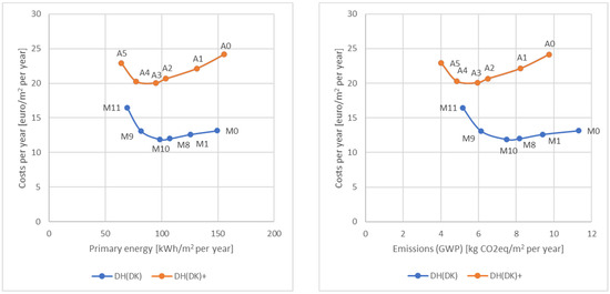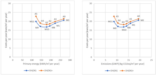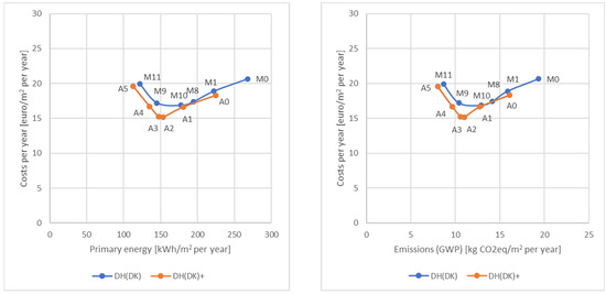 The purpose of the first analyses is to determine how an increased share of renewable energy in the energy mix will influence the cost-optimality of renovation measures, i.e., how will the decarbonization of energy systems influence the balance between energy efficiency and renewable energy. The calculation compares the situation corresponding to the existing energy mix of today and the expected future energy mix as described in Table 7. Results are plotted in Figure 4 where M0 and A0 are the reference scenarios, M1 and A1 correspond to replacing the windows, M8 and A2 correspond to adding PV, M10, and A3 to insulating roofs, M9 and A4 to insulating walls, and finally M11 and A5 to installing mechanical ventilation with heat recovery. The order of the measures corresponds to starting with the lowest simple payback time and gives the curves their distinct look with an easily interpretable minimum that signifies the cost-optimal solution. DH (DK) is the present energy mix in Denmark and DH (RE) is an energy mix corresponding to the scenario described in Table 7, i.e., where 50% of energy is based on renewable sources. The results are shown in Figure 4 as the primary energy use as a function of the total costs per year (left) and the emissions as a function of the total costs per year (right).