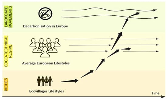 To analyse the transition potential in the broader context of society, we need to consider the ecovillage within a framework that links systems across scales. The multi-level perspective (MLP) framework is one approach among others for conceptualising transformations to sustainability in sociotechnical systems [19]. It combines ideas from evolutionary economics, sociology of innovation, and neo-institutional theory to conceptualise overall dynamic patterns in system transformation [20]. Contrary to a top-down approach, the MLP allows the inclusion of different actors and highlights the role of individuals in the transition (bottom-up approach). It comprises a nested hierarchy of regimes embedded within landscapes and niches within regimes (Figure 1). Although there are three different levels, the system is characterized by being dynamic. Thus, transformations result from the interaction between processes at different levels [19].