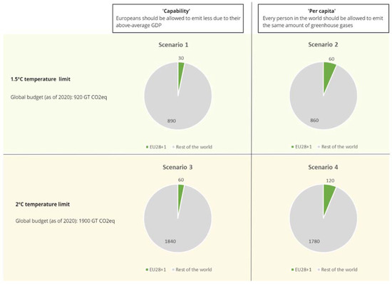 To assess the relevance of this carbon reduction to the broader context, we considered the total carbon budget in scenario analysis. The total carbon budget is defined by the IPCC [28] and EUCalc [17] as the GHG emissions that can still be emitted worldwide to have two out of three chances of limiting global warming by 1.5 °C or 2 °C by the end of this century. Thus, two factors are considered important for mitigating climate change. First, limiting the temperature rise to either 2 °C or 1.5 °C relative to preindustrial levels by the year 2050 through a reduction in CO2eq emissions [21,22]. Second, consider the factor of the ‘fair share’ of global CO2eq emissions. Here, two options are considered: (1) every person in the world should be allowed to emit the same amount of GHG (‘per capita’), or (2) Europeans should emit less GHG due to their above-average GDP compared to people from less developed countries (‘capability’) [17].