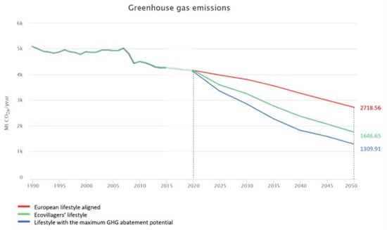 The transition pathways until the year 2050 were calculated for three lifestyles (Figure 8). The first is the European lifestyle, which was aligned with [27] and considered the main sectoral assumption and outputs of the EU-Reference as detailed in [27] and can be selected with data from EUCalc [17]. Second, the ecovillagers’ lifestyle is based on the ALs in Table 4 from our survey results. Finally, the lifestyle with the maximum GHG abatement potential considering that all key behaviours’ scopes meet AL4 and can be selected with data from EUCalc [17].