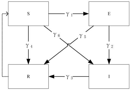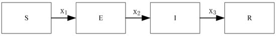 When studying the propagation of miners’ safe behavior, many scholars borrowed from the model of infectious disease: susceptible–exposed–infected–removed (SEIR) [33]. In this model, refers to the sate in which people are safe but easily affected by the disease; refers to the sate in which people touched the disease but are not affected by the disease now; refers to the state in which people were affected by the disease and had the attributes to propagate the disease; refers to the sate in which people experienced the disease but are cured and have the immune ability to the disease. Figure 1 shows the traditional model of , where represent the conversion rate between the anterior and posterior states, respectively.