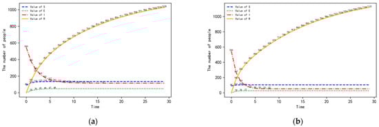 If the enterprise increases the implementation of the management system of safety partnership, which would mean that the miners are more affected by the incentive policy of rewards and punishments, the changing trend of the propagation of miners’ safe behavior will also change. The change in the number of miners was analyzed, as shown in Figure 3b, when , , , , , , and . It can be found from Figure 3b that the trend of the number of miners in the four states is consistent with the trend in Figure 3a. However, it is different that, compared to Figure 3a, the number of miners who perform unsafe behavior decreased faster and the number of miners who are not susceptible to unsafe behavior increased faster in Figure 3b.
