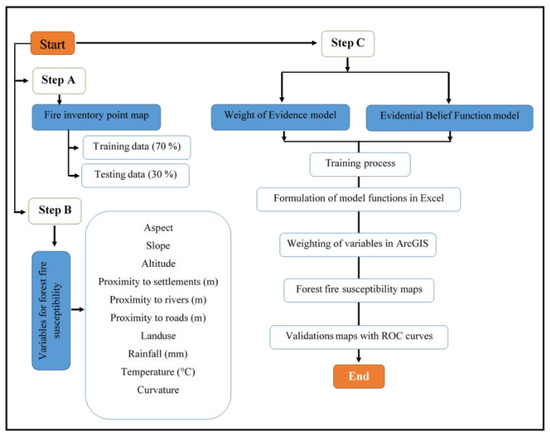The 284 fires having occurred in Marivan County were divided into two parts, including the training data (70%; 199 incidents) and the validation data (30%; 85 incidents). The fire information was provided by the Department of Natural Resources and Watershed Management of Marivan City. Then altitude, slope percentage, slope direction, distance from roads, distance from rivers, distance from settlements, land use, slope curvature, average annual rainfall, and average temperature, which have been identified as factors affecting the potential of forest fire risks, were used to produce the fire risk zoning map. The methodology used in this study is graphically represented in Figure 2.