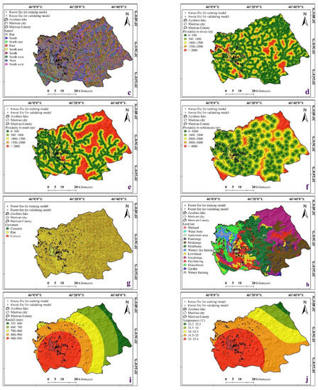 Forest fire ignition factors used in this study: (a) elevation map; (b) slope map; (c) aspect map; (d) proximity to rivers; (e) proximity to roads (m); (f) proximity to settlements (m); (g) curvature; (h) land use; (i); rainfall map, and (j) maximum temperature map.