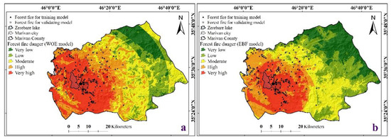 The fire potential maps using the WOE and EBF models are illustrated in Figure 4. The areas and percentage of floor areas of potential fire occurrence are listed in Table 2. As Table 2 shows, the results of the two models of WOE and EBF showed that about 76 and 62% of the study area were in the moderate to very high classes, respectively.