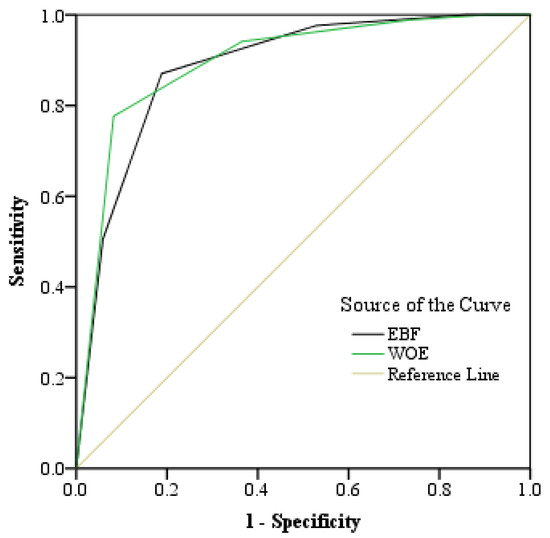 To validate the fire potential maps, the ROC curve was utilized. The area under the ROC curve is named AUC; if its value is less than 0.5, it will indicate the inaccuracy of the model, and if its value ranges from 0.5 to 1, it will indicate the accuracy of the model for predicting the presence or lack of any fire potentials. Table 3 shows AUC values for the evaluated models based on the validation data presented. In addition, Figure 5 presents the ROC curve of the evaluated models based on the validation data. Among the WOE and EBF models that were studied, the highest accuracy was related to the WOE model (0.896). Hence, in terms of identifying fire potentials, the WOE model delivered a better performance than the EBF model.