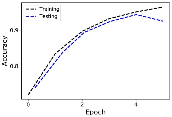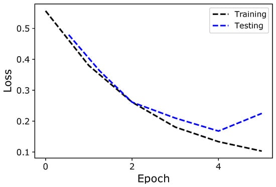 In this section, we analyze the performance of the proposed model using accuracy and loss curves for training and testing data. Figure 2 shows the performance of the model on training and test data using accuracy curves. Both curves move side-by-side with a small difference, indicating that the proposed model does not suffer from overfitting. However, after the fourth epoch, the test accuracy starts to decrease, which means that the model suffers from overfitting. Thus, if more than four epochs are trained, the performance of the model decreases. To improve the model’s performance in the future, meta-heuristic algorithms will be used to help select the optimal parameters for deep and machine learning to avoid overfitting. It is very complex and time-consuming to select these parameters manually.