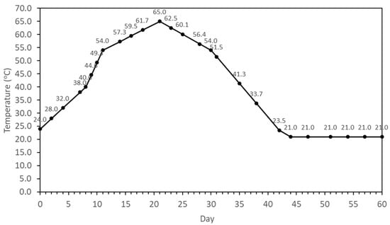 One hundred W-seeds and N-seeds were placed in an oven with set temperature changes simulating a typical composting process (Figure 1). The temperature profile was referred to the temperature profile of the composting treatment used by a local yard waste recycling company (Eco Greentech Limited, Hong Kong, China), which used a typical composting method. A typical composting process is characterized by four different phases based on the temperatures, namely the mesophilic phase; thermophilic phase; second mesophilic phase; and, lastly, maturation/curing phase. The temperature of the compost can reach >65 °C [31] and maintain at >55 °C for a certain period [7] to destroy pathogens and weeds. The whole treatment lasted for 60 days, with the first 30 days as the active phase and the remaining 30 days as the curing phase. The settings of the temperature profile were as follows (Figure 1): the first 8 days (day 0 to day 8) were the mesophilic phase, and the temperatures increased from 24 °C to 40 °C. The next phase was the thermophilic phase that lasted for 22 days (day 8 to day 30). The temperature in this phase started from 40 °C and increased rapidly to reach 65 °C on day 21, and then decreased gradually to 54 °C in the remaining 9 days. The next 13 days (day 30 to day 43) were the mesophilic phase. At this phase, the temperatures decreased quickly from 54 °C to 21 °C. In the last 17 days (day 43 to day 60), which was the maturation phase, the temperatures were maintained at 21 °C. A germination test was performed for the treated seeds later. One hundred seeds that did not receive the thermal treatments were included as a control.