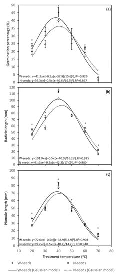 Overall, the variations of germination percentage, as well as radicle and plumule growth, among the seeds receiving constant temperature treatments followed a very similar pattern along with the different temperature levels (Figure 2). The relationships of these three dependent variables and the treatment temperature were well fitted to the Gaussian models, forming the bell curves. The germination percentage, radicle length, and plumule length all increased as the temperature rose initially and began to decrease as the treatment temperature increased. For the W-seeds, it was predicted that the germination percentage, radicle length, and plumule length would start to decline when the temperature treatments were over 37.9 °C, 40.0 °C, and 38.9 °C, respectively. The corresponding temperature thresholds for N-seeds were 40.6 °C, 42.3 °C, and 40.7 °C, which were all slightly higher than that of the W-seeds. Though the W-seeds and N-seeds showed a similar trend of variations for all the three germination parameters, the W-seeds generally had a better germination performance at a lower temperature. This trend was absent or even reversed at a higher temperature. The N-seeds tended to be similarly or even less suppressed when the treatment temperature was higher.