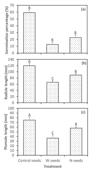 The (a) germination percentage, (b) radicle length, and (c) plumule length of the control seeds, composting-temperature-treated seeds mixed with wood chips (W-seeds), and composting-temperature-treated seeds present alone (N-seeds) of Leucaena leucocephala after a 7-day germination test. Different letters denote significant differences across different treatments.