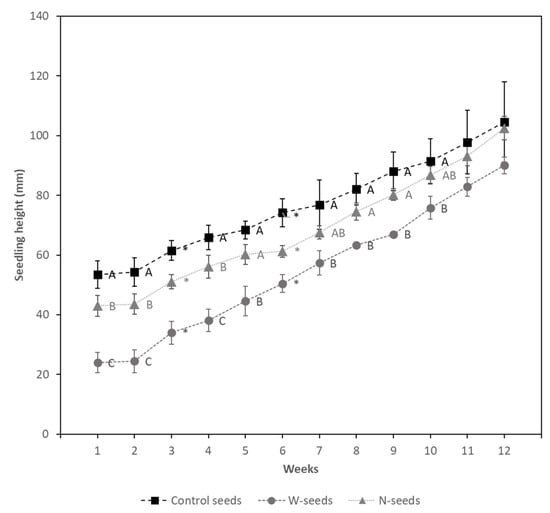 The height of the Leucaena leucocephala seedlings from the control seeds, composting-temperature-treated seeds mixed with wood chips (W-seeds), and composting-temperature-treated seeds present alone (N-seeds) throughout a three-month (12 weeks) growing period. Different letters denote significant differences in height across different treatments in the same week. * denotes a significant difference of height detected by the Kruskal–Wallis H test, but not by post-hoc pairwise comparison, at weeks 3 and 6, in which the data were not normal.