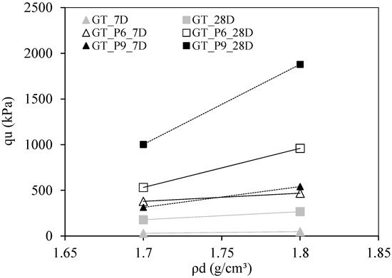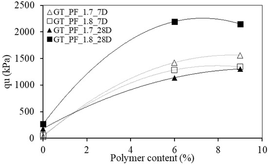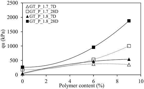 In Figure 10 the relationship between curing time and polymer content is shown. As in all cases mentioned, at seven days, there is a stabilization of the compressive strength. At 28 days, the curves show a polynomial behavior, with a slight decrease of the qu for the 9% content and the 6% content for the highest dry unit weight.