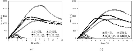 Stress–strain curves for polymer-fibers composites: (a) polymer content of 6%; (b) polymer content of 9%.