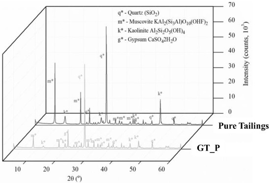 The mineralogical analysis is presented in Figure 11. For the pure tailings, it indicated the presence of quartz (SiO2), Muscovite (KAl2(Si3Al)O10(OH1F)2, and Kaolinite (Al2Si2O2(OH)4), in agreement with the composition reported by Festugato et al. [20]. In the composite (GT_P), a portion of gypsum was identified in addition to the reduction of the frequency of minerals identified for pure waste (CaSO4H2O).