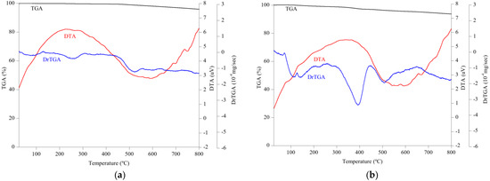 The thermogravimetric analysis (TGA/DTG) was obtained from the Shimadzu DTG-60H model using oven-dried powder samples. The experiments were conducted in an inert atmosphere (N2), with a heating rate of 10 °C/min and a 30 mL/min gas flow from room temperature to 800 °C in a platinum pan.