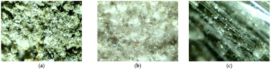 The second composite is formed by the tailings matrix, the same polymeric solutions content, and polypropylene fibers (GT_PF). The reinforcement was added in a content of 0.5% by matrix mass since this amount has been satisfactorily used in several studies in the literature [13,17,32,33,34]. The mixture was made in a systematic process, alternating layers of tailings and fibers, and pulverizing the polymer solution, after which the mixture was homogenized until uniformity was visually observed.