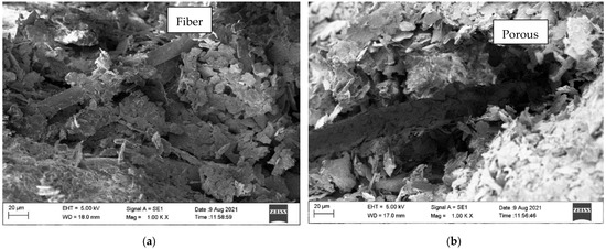 This analysis shows that the polymer acts with a cohesive effect by filling the voids in the sample, connecting the particles, and, consequently, decreasing the medium’s permeability. It is consistent with the literature that identified the development of interconnection bonds between grains, adhesion between adjacent grains, and coating grains with a thin polymer film by SEM tests [50,51]. Nevertheless, the fiber addition promoted increased porosity due to the voids formed around the fiber [52].