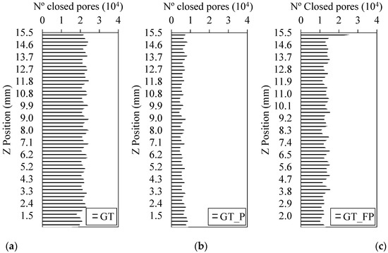 From the information presented, it is possible to see a reduction of porosity from 8.77% to 0.85% in the case of the GT_P. On the other hand, GT_PF presents a porosity of 4.19%. A more detailed analysis, illustrated in Figure 20, shows the sample’s open and closed pores distribution.