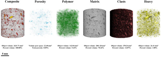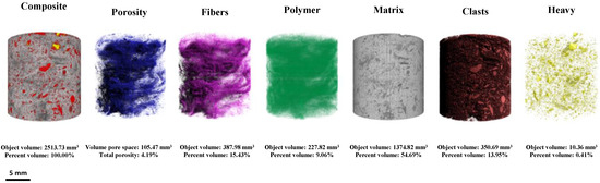 In the three-dimensional analysis, it is possible to evaluate the volumes of each component that constitutes the materials. Pure tailings comprise pores, a matrix, clasts, and heavy minerals. In the GT_P composite, besides the elements mentioned, there is the polymer portion, and in the GT_PF composite there are fibers in addition to the others.