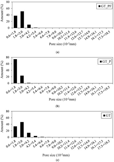 Pore size distribution calculated from μCT analysis. (a) pure tailings; (b) GT_P; (c) GT_PF.