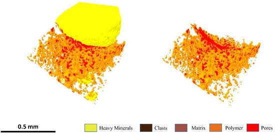 Since the polymer acts as a binder, a more detailed analysis of the heavy minerals was performed to assess whether the polymer could immobilize these elements during a leaching process. According to Figure 25, it can be seen that the polymer acts as a barrier to heavy minerals. This may immobilize these elements. This is an interesting finding from an environmental point of view since these heavy minerals may contain metals with toxicological potential.