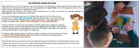 | I. Identification stage | - To explore and share their own ideas about the issue. - To identify key aspects of the problem. | The problem arises from an 11-year-old girl whose family runs a restaurant on the Mar Menor coast and, therefore, has been affected by the problem (Figure 1). The girl introduces the key questions and asks the participants to look for responses. |