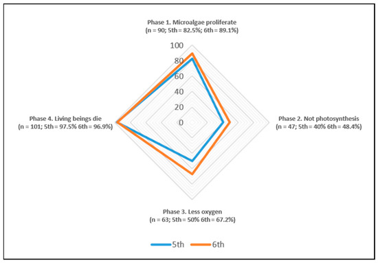 When comparing both grades, although a certain tendency was observed for sixth graders for more precisely describing the eutrophication process, these differences were not significant (Z = −1.115; p = 0.265).