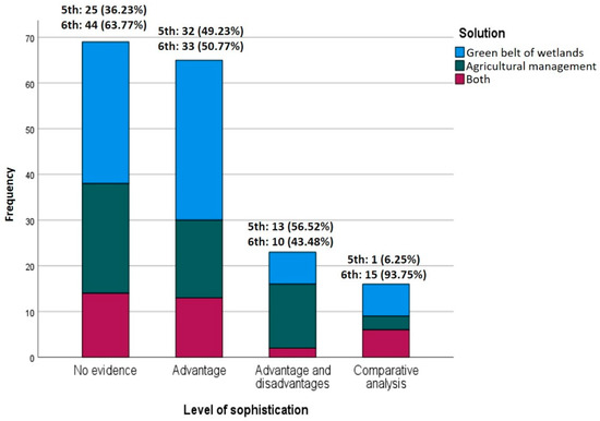 Considering the proposed solutions on a global scale, there was a tendency for sixth grade students to opt for wetlands compared with fifth graders, who would prefer agricultural planning. However, these differences were not statistically significant (Z = −0.813, p = 0.416). Regarding the level of sophistication in their answers in consideration of the total group of students, there was no significance either (Z = −1.818, p = 0.069). However, within the specific set of students that offered solutions aimed at correction or prevention—which included the vast majority of students—sixth grade students suggested more sophisticated approaches (Z = −2.930, p = 0.003).