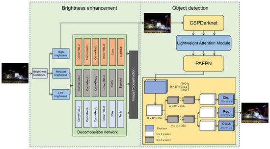 We add a brightness decision layer to the RRDnet brightness enhancement neural network for brightness enhancement and denoising. No processing is performed for high-brightness images, but we use different strategies for brightness enhancement and denoising for medium-brightness and low-brightness images. The network is a new type of three-branch convolutional neural network that decomposes the image into illumination components, reflection components and noise components. By designing an iterative loss function without image pairs, noise can be effectively estimated, and illumination can be recovered. The general idea is as follows: first, the unexposed image is decomposed into three branches through the decomposition network, namely, the estimated reflection component, estimated illumination component and noise component. Then, in the reconstructed network, the lighting components are processed through a gamma transformation. The reflection component is the result of the input image minus the noise component divided by the illumination component. Finally, the image is reconstructed according to the Retinex [27] theory. For weight updates, a three-part loss function is used: