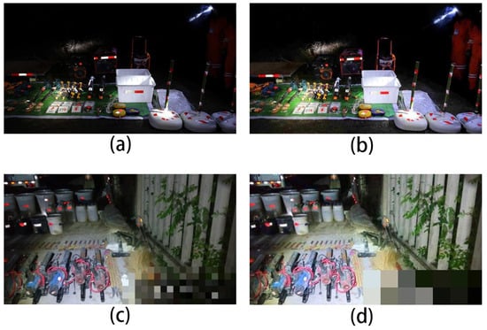 Since the low-brightness image and medium-brightness image have different requirements for the noise suppression, smoothing force and gamma transformation, the low-brightness image usually has more noise and weaker texture information than the medium-brightness image, and thus, we can better construct the appropriate loss function of the two types of images by setting different , and gamma values, where and of the low-brightness images are larger than those of medium-brightness images, and the value of the gamma transformation is lower than that of medium-brightness images. In this paper, repeated experiments are designed: the extreme value of gamma is set to 0.1 to 1, and the step size is 0.1; the extreme value of is set to 1 to 3, and the step size is 1; the extreme value of is set to 3000 to 10,000. The results are analyzed to determine that the value of the gamma transformation of the dark image is 0.1, , and , and those of medium-brightness images were determined as 0.4, , and . The image enhancement effect is shown in Figure 3, which shows that the brightness enhancement of image samples can greatly improve the validity of the dataset.