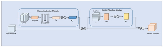 For a given feature map, the lightweight attention module sequentially infers the attention map along the two independent dimensions of channel and space and then multiplies the attention map with the input feature map to perform adaptive feature refinement. For the specific operations below, channel attention processing is first carried out, and the input feature layer is divided into G groups along the channel dimension. Then, the feature mapping in each channel is aggregated through the global average pooling operation (GAP) to generate the corresponding weight information. To adaptively generate the attention weight between channels and improve the computational efficiency, a multilayer perceptron (MLP) with a hidden layer and ReLU activation function are used, and the sigmoidal activation operation is also used after MLP processing. The calculation formula of the channel attention weight generated by each group is as follows: