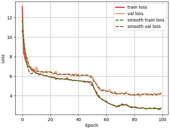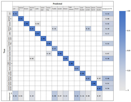 In the training process, the loss curve of our model is shown in Figure 6. It can be found from the figure that the loss curve gradually tends to be stable with the increasing number of training rounds. When the epoch reached approximately 80, the model gradually converged, and no overfitting phenomenon occurred in the training process. The confusion matrix (condidence = 0.25, iou = 0.65) of the model is shown in Figure 7.