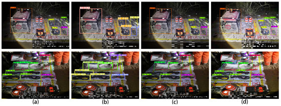 In Figure 8, Figure 9 and Figure 10, we compare some detection tool results of our model with Retinanet, YOLOv5s, and YOLOX in high-, medium-, and low-brightness image environments. Column a is the test result of Retinanet, column b is the test result of YOLOv5s, column c is the test result of YOLOX, and column d is the test result of our model. After comparison, we can see that in the first row of Figure 8, the detection results of our model are roughly the same as those of YOLOv5, and both are better than those using Retinanet and YOLOX. In terms of details, the detection grinder of our model has better adaptability. In the second row, our model has the best detection results, detecting 10 target objects with high accuracy. In Figure 9, for the detection results of medium-brightness images, compared to the first row, when the other three networks only detected 5 objects, our model has a higher detection rate in the face of wires with complicated overlapping situations. Comparing the second line, it can be seen that although Retinanet has completed the detection of all objects, the detection of woven bags has the same false detection as YOLOv5s, and YOLOv5s detects one fewer wire, while YOLOX detects two fewer wires; meanwhile, our model detected all items with high detection accuracy. In Figure 10. we compared the detection capabilities of the four networks in the dark environment. In the dark environment, our model has enhanced brightness. Compared with the first line, Retinanet has the fewest detection results, while for YOLOv5s, although there are many detection results, there are many false detections for shovels and wires. Compared with YOLOX, our model has better robustness in the face of highly overlapping wires, and the detection rate is higher than that of YOLOX. Comparing the second row, it can be clearly seen that the detection results of our model and YOLOv5s are still relatively complete, Retinanet lacks the detection of the blower, and YOLOX fails to detect a cement bucket in the dark. On the whole, our model has a higher detection ability than Retinanet, YOLOv5s and YOLOX in the full time domain and multi-superposition environment.
