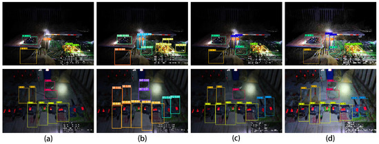 Comparison chart of low-brightness image detection results. (a) Retinanet. (b) YOLOv5s. (c) YOLOX. (d) Our model.