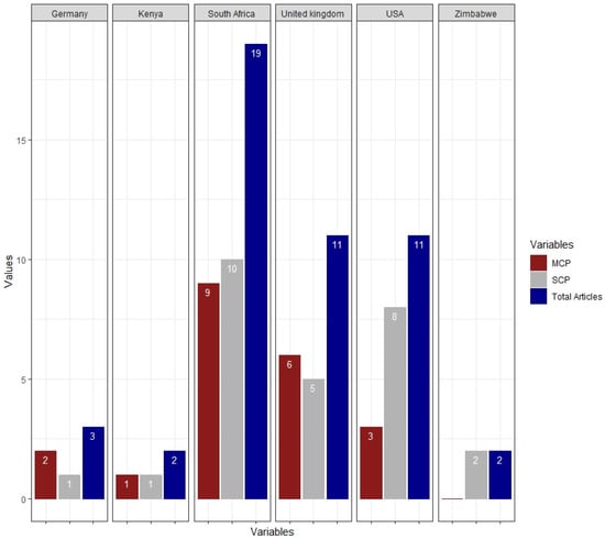 Figure 1 displays countries that carried out studies on WEF nexus in Africa only or African countries (Single Country Publications (SCP)), and those studies which focus on Africa or African countries along with other countries (Multiple Country Publications (MCP)) from 1980–2021. According to Figure 1, the top 6 most productive countries in the production of WEF nexus articles are South Africa, the United Kingdom, the USA, Germany, Kenya and Zimbabwe. Figure 1 shows that South Africa is the country with the highest number of published articles with 19 publications, 10 of which were published under single-country multi-country collaborations and 9 through multi-country collaborations. With 11 publications, the United Kingdom and the USA rank second with 5 and 8 single-country publications, respectively, and 6 and multi-country publications respectively. It’s important to note that the ranking of countries depends on the affiliation of the main author at the time of the publication.