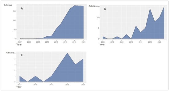 Annual distribution of publications published in (A) Global, (B) Africa and (C) South Africa.