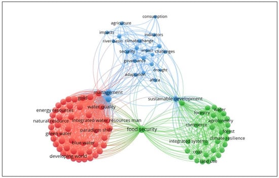 Keywords have been extracted from the titles or abstracts of the 65 analysed publications (these are the author’s keywords) and were grouped into 3 clusters (red, green and blue) using a strength association methodology. The circles with the same colour suggested a similar topic among the publications. The red cluster represents keywords that are related to the application of the WEF nexus. The green cluster represents keywords that are related to the implementation of the WEF nexus, while the blue cluster represents keywords that are related to the implications of the WEF nexus (Table 3).
