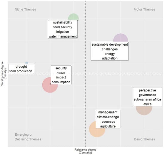 Located in the upper-left quadrant are the niche themes (Figure 4) [39]. They have a lower value of centrality and higher values of density (Table 4). They are strongly developed but still marginal in the field of WEF nexus in Africa. The niche themes in this analysis contained seven themes, as presented in Table 5. The niche themes quadrant contains two main clusters, as displayed in Figure 4. The most recurring words connected to the sustainability cluster for the period of this study were “food security”, “irrigation”, and “water management” (Figure 4). The most recurring word associated with the cluster drought is “food production”.