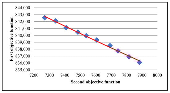 The proposed robust possibilistic MIP approach was applied based on the aforementioned input parameters. In this respect, the well-known SAUGMECON method was implemented to take into account the bi-objective nature of the presented model. Notably, this method could provide an appropriate approximation of the Pareto optimal points for the decision makers. Meanwhile, the obtained Pareto optimal points are depicted in Figure 4 concerning the Pareto frontier points from the payoff table and minimizing both objective functions.