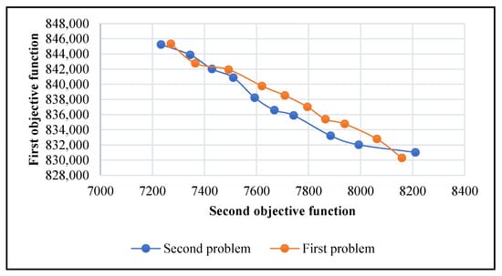 In this section, numerical examples are defined based on the prepared numerical experiment in Section 4.1. In this manner, the generated numerical examples are provided by simulating the input parameters based on the defined parameters in Table 1. However, two simulated problems were solved based on a bi-objective robust possibilistic MIP model. The obtained results are reported for the main variables in Figure 5, Figure 6 and Figure 7. In this respect, the objective function values and Pareto optimal points for both problems are depicted in Figure 5. As represented in this figure, the trend of the objective function values is the same and confirms the scale ranges of the main numerical experiment.